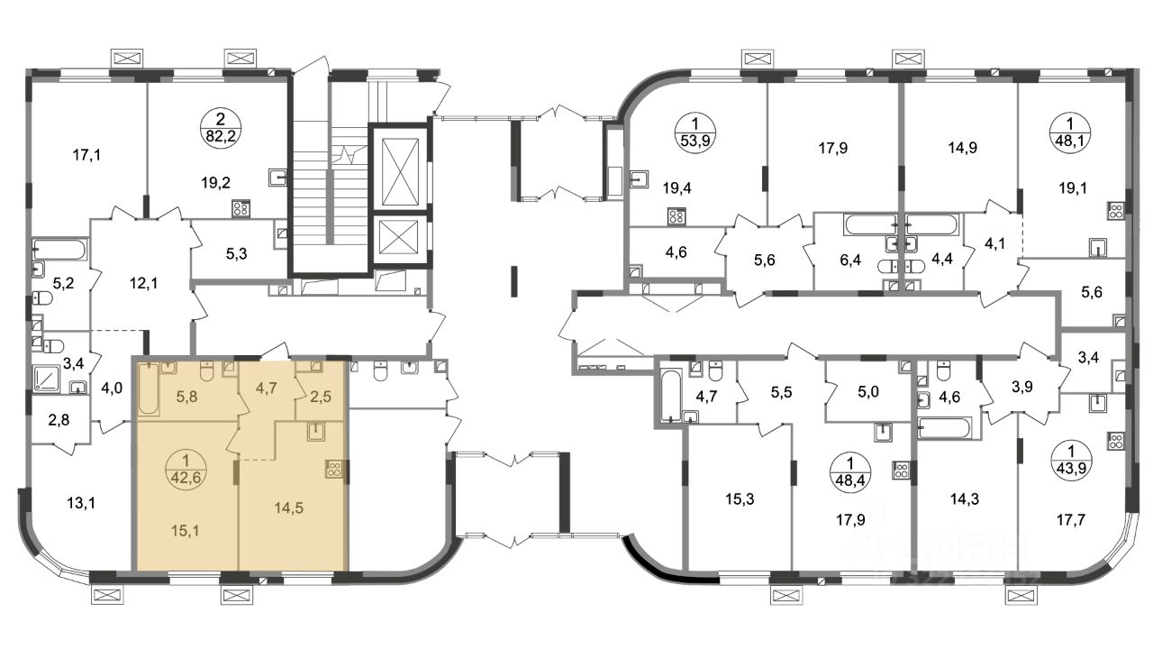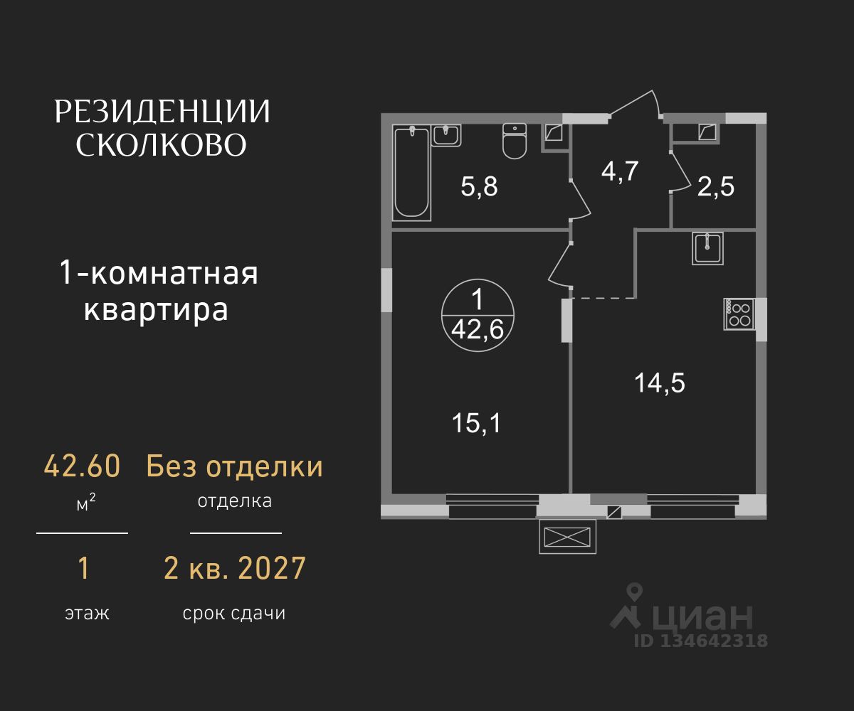 Общая площадь квартиры - 42,6 кв. м, этаж 1 из 9.