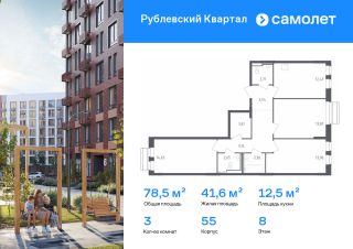 Строим кварталы для жизни с заботой о будущем. Предлагается 3-комнатная квартира комфорт-класса 78,51 кв.м в корпусе 55 на 8 этаже, в ЖК "Рублевский Квартал"