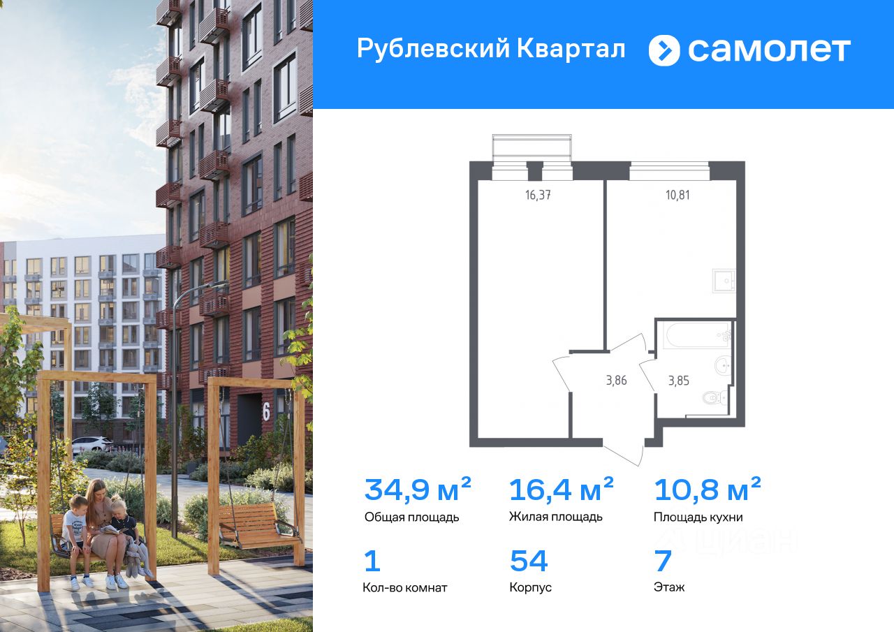 Строим кварталы для жизни с заботой о будущем. Предлагается 1-комнатная квартира комфорт-класса 34,89 кв.м в корпусе 54 на 7 этаже, в ЖК "Рублевский Квартал"