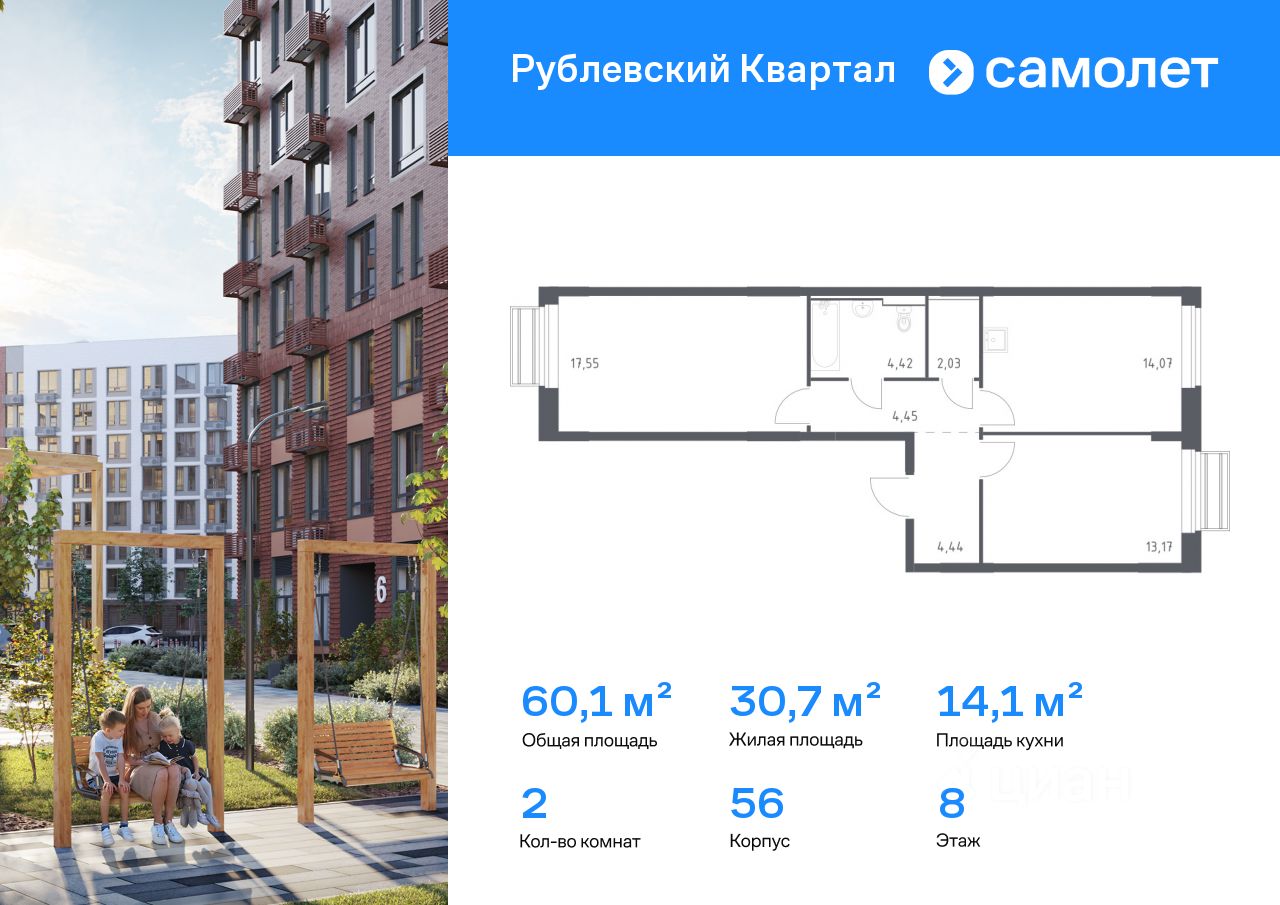 Строим кварталы для жизни с заботой о будущем. Предлагается 2-комнатная квартира комфорт-класса 60,13 кв.м в корпусе 56 на 8 этаже, в ЖК "Рублевский Квартал"
