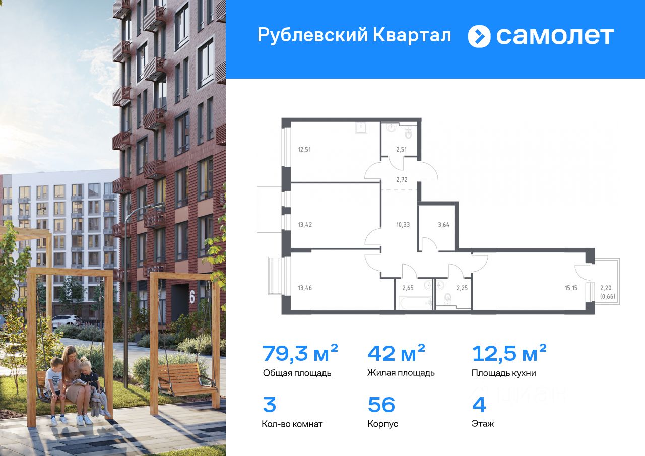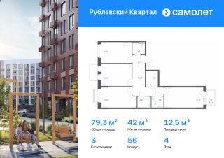 Строим кварталы для жизни с заботой о будущем. Предлагается 3-комнатная квартира комфорт-класса 79,3 кв.м в корпусе 56 на 4 этаже, в ЖК "Рублевский Квартал"