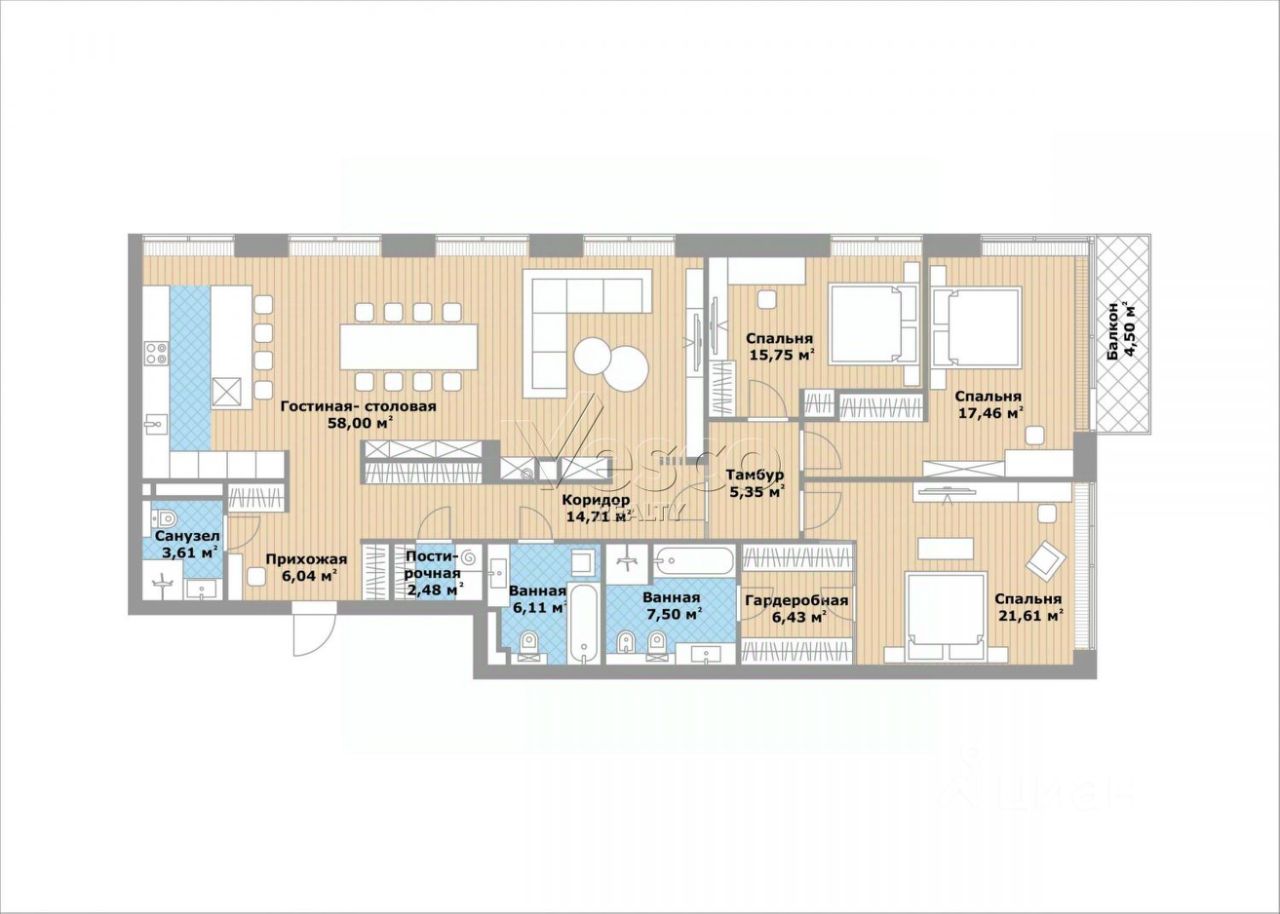 Прихожая (6), гостевой с/у (3,6), кухня-столовая-гостиная (58), спальня 1 (15,8) и спальня 2 (17,5) с балконом (4,5), ванная комната (6,1), мастер-спальня (21,6) с гардеробной (6,4) и ванной комнатой (7,5), постирочная (2,5), холлы (14,7+5,3).