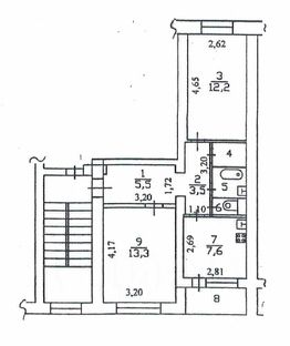 Две изолированные комнаты — 12,2 м² и 13,3 м², кухня 7,6 м² с выходом на балкон 3,2 м², гардеробная 1,6 м².