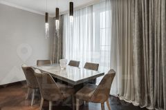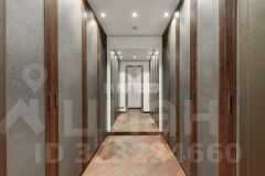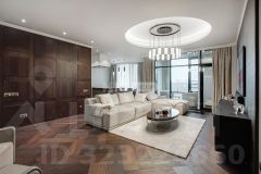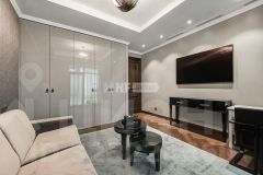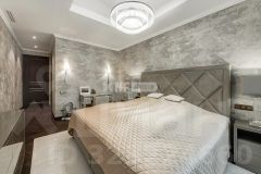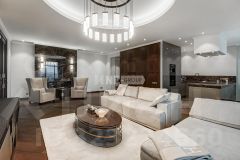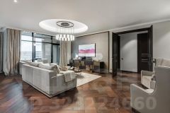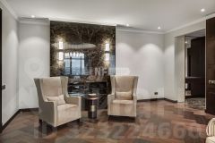 Выполнена отделка в классическом стиле с применением натуральных материалов: обои от домов моды Gucci и Armani, немецкий паркет "ёлочка", покрытый матовым лаком, двери из натурального дерева, пол и стены в санузлах облицованы слэбами из натурального мрамора.