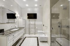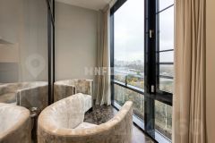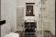 Сантехника Axor в коллаборации с французским домом Lalique. Ванная комната укомплектована итальянской мебелью, установлен водяной полотенцесушитель. В санузлах предусмотрена система влагоудаления.