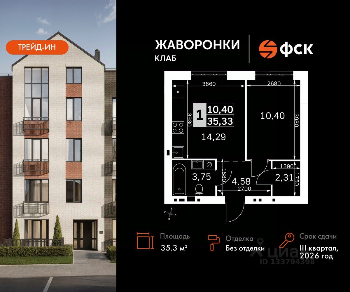 Продаётся 1-к квартира номер 118 общей площадью 35.33 кв.м на 2-м этаже 4 этажного дома. Без отделки.
