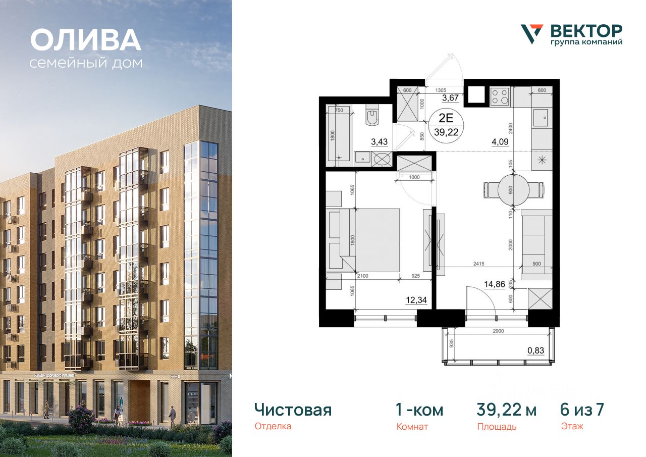 Продается 1-комн. квартира площадью 39,22 кв.м на 6 этаже 7 этажного дома в ЖК "Семейный дом Олива" от федерального девелопера ГК "Вектор".