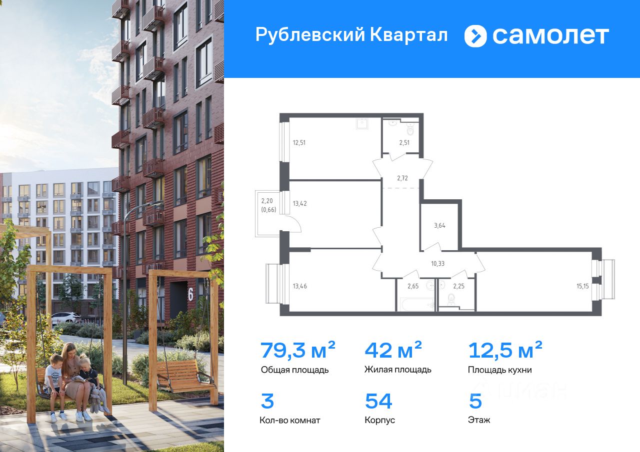 Строим кварталы для жизни с заботой о будущем. Предлагается 3-комнатная квартира комфорт-класса 79,3 кв.м в корпусе 54 на 5 этаже, в ЖК "Рублевский Квартал"