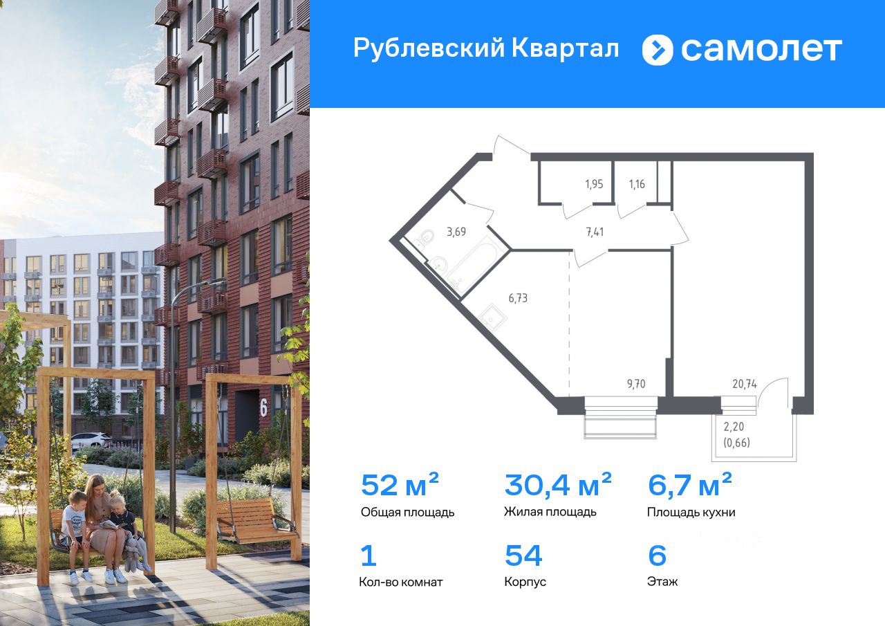 Строим кварталы для жизни с заботой о будущем. Предлагается 1-комнатная квартира комфорт-класса 52,04 кв.м в корпусе 54 на 6 этаже, в ЖК "Рублевский Квартал"