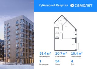 Строим кварталы для жизни с заботой о будущем. Предлагается 1-комнатная квартира комфорт-класса 51,38 кв.м в корпусе 54 на 4 этаже, в ЖК "Рублевский Квартал"