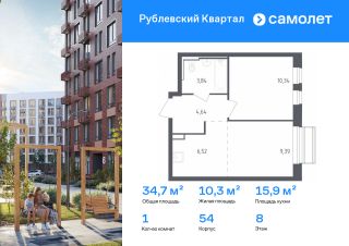Строим кварталы для жизни с заботой о будущем. Предлагается 1-комнатная квартира комфорт-класса 34,73 кв.м в корпусе 54 на 8 этаже, в ЖК "Рублевский Квартал"