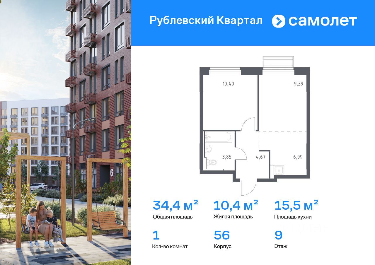 Строим кварталы для жизни с заботой о будущем. Предлагается 1-комнатная квартира комфорт-класса 34,4 кв.м в корпусе 56 на 9 этаже, в ЖК "Рублевский Квартал"