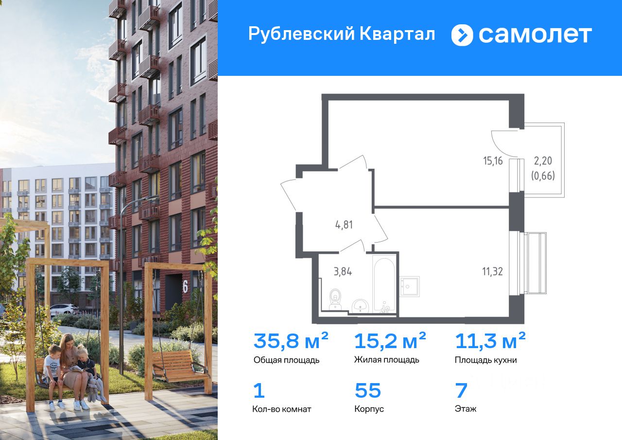 Строим кварталы для жизни с заботой о будущем. Предлагается 1-комнатная квартира комфорт-класса 35,79 кв.м в корпусе 55 на 7 этаже, в ЖК "Рублевский Квартал"