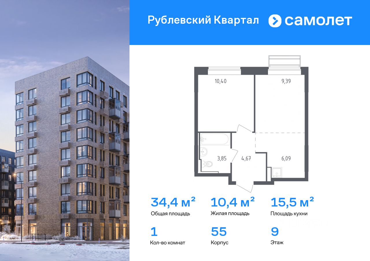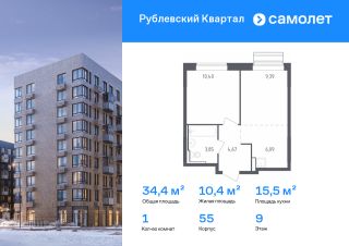Строим кварталы для жизни с заботой о будущем. Предлагается 1-комнатная квартира комфорт-класса 34,4 кв.м в корпусе 55 на 9 этаже, в ЖК "Рублевский Квартал"