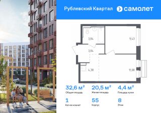 Строим кварталы для жизни с заботой о будущем. Предлагается 1-комнатная квартира комфорт-класса 32,57 кв.м в корпусе 55 на 8 этаже, в ЖК "Рублевский Квартал"