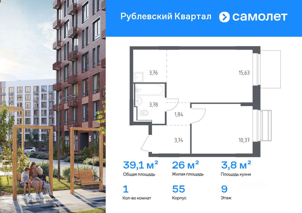 Строим кварталы для жизни с заботой о будущем. Предлагается 1-комнатная квартира комфорт-класса 39,12 кв.м в корпусе 55 на 9 этаже, в ЖК "Рублевский Квартал"