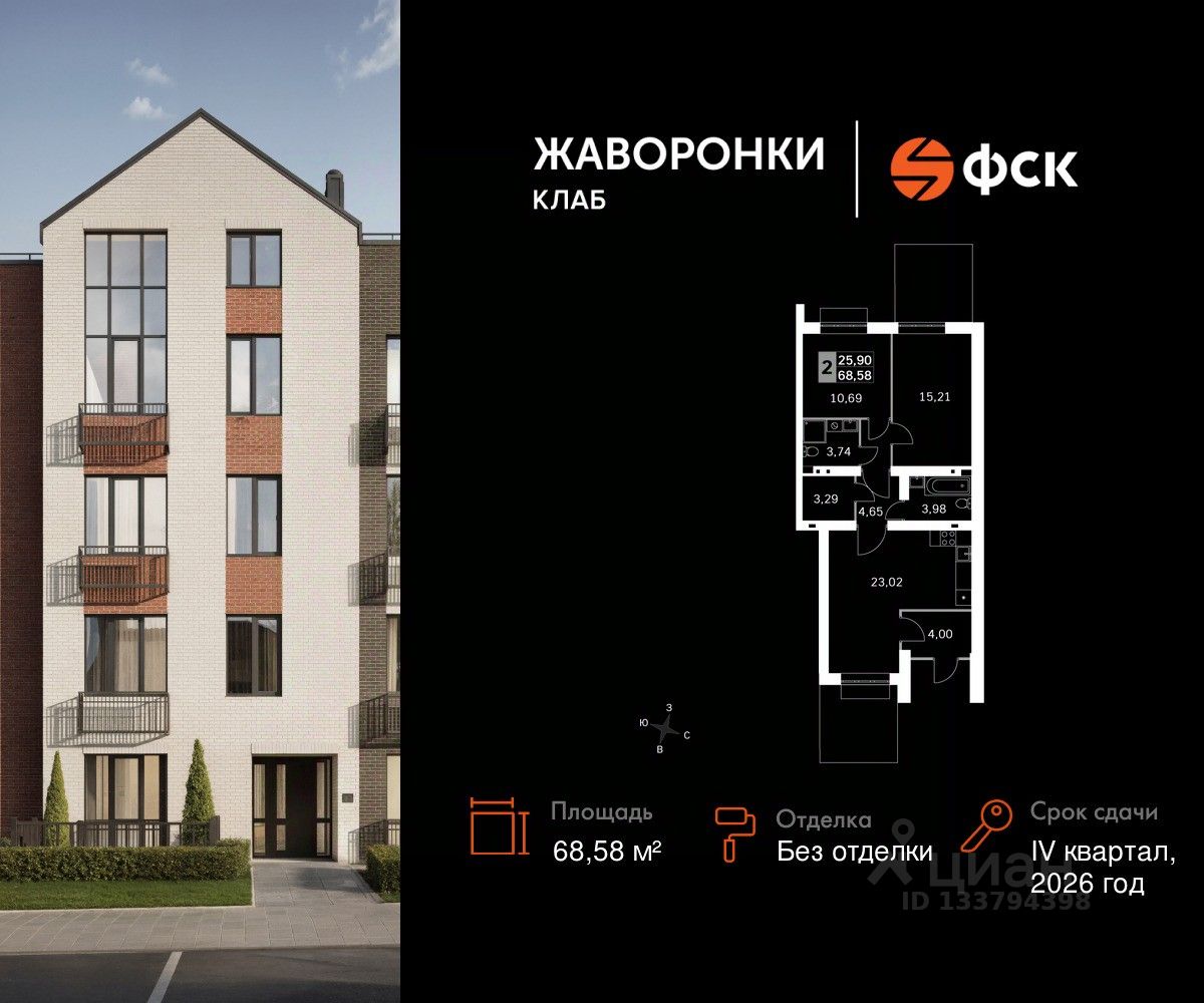 Продаётся 2-к квартира 105 общей площадью 68.58 кв.м на 1-м этаже 4 этажного дома. Без отделки.