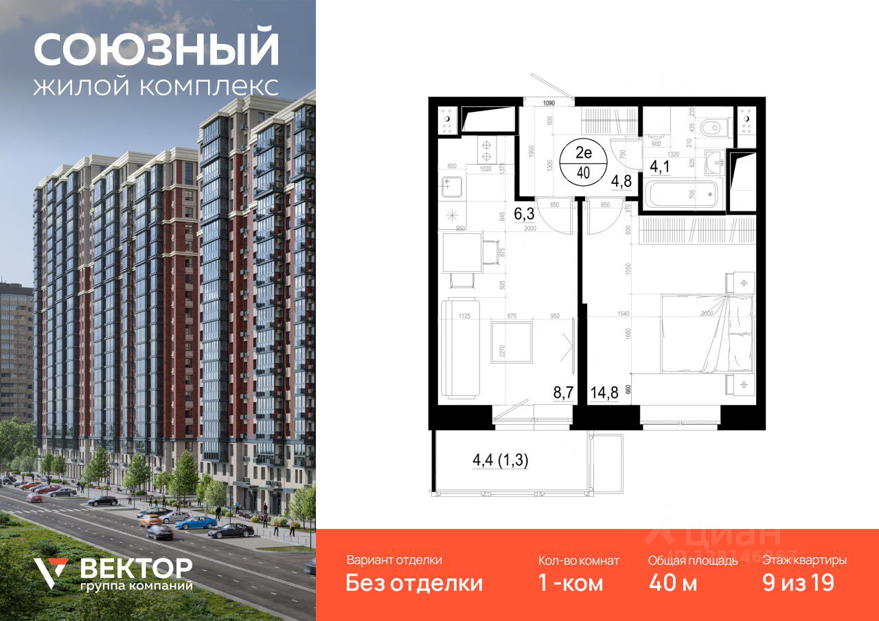 Продается 1-комн. квартира площадью 40 кв.м на 9 этаже 19 этажного дома в ЖК "Союзный" от федерального девелопера ГК "Вектор".