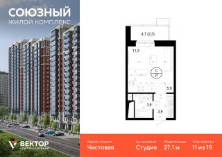 Продается 1-комн. квартира площадью 27,1 кв.м на 11 этаже 19 этажного дома в ЖК "Союзный" от федерального девелопера ГК "Вектор".