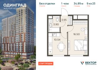 Прямая продажа от застройщика. Продается 1-комн. квартира площадью 34,89 кв.м на 9 этаже 23 этажного дома в ЖК "Одинград" от федерального девелопера ГК "Вектор".