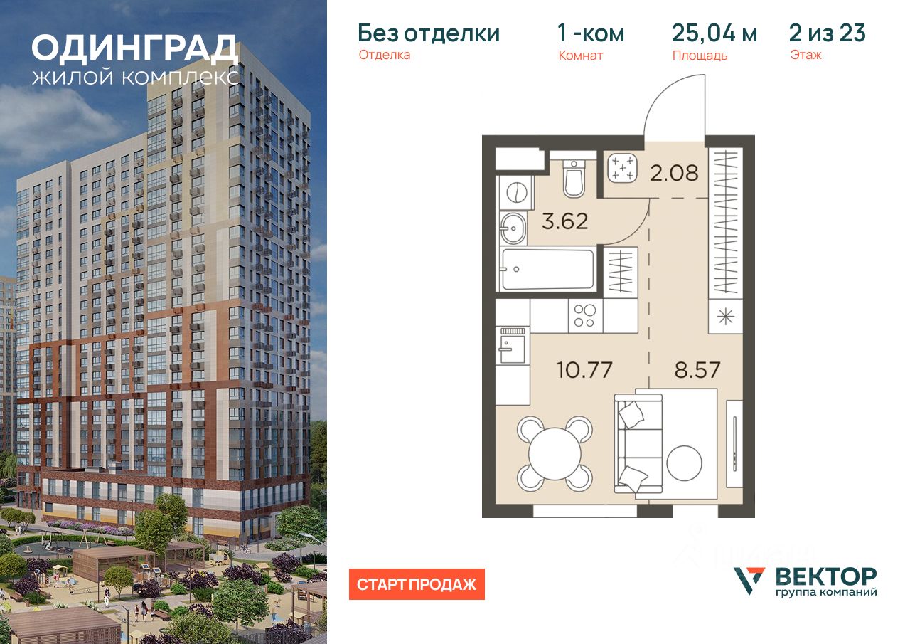 Прямая продажа от застройщика. Продается 1-комн. квартира площадью 25,04 кв.м на 2 этаже 23 этажного дома в ЖК "Одинград" от федерального девелопера ГК "Вектор".