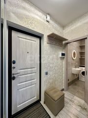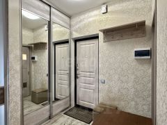 При входе спрятана гардеробная за дверью-купе с зеркалом.