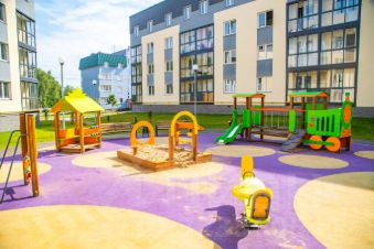 Дом располагается в центре ЖК и хорошо изолирован соседними домами от шума Минского шоссе и железнодорожных путей.