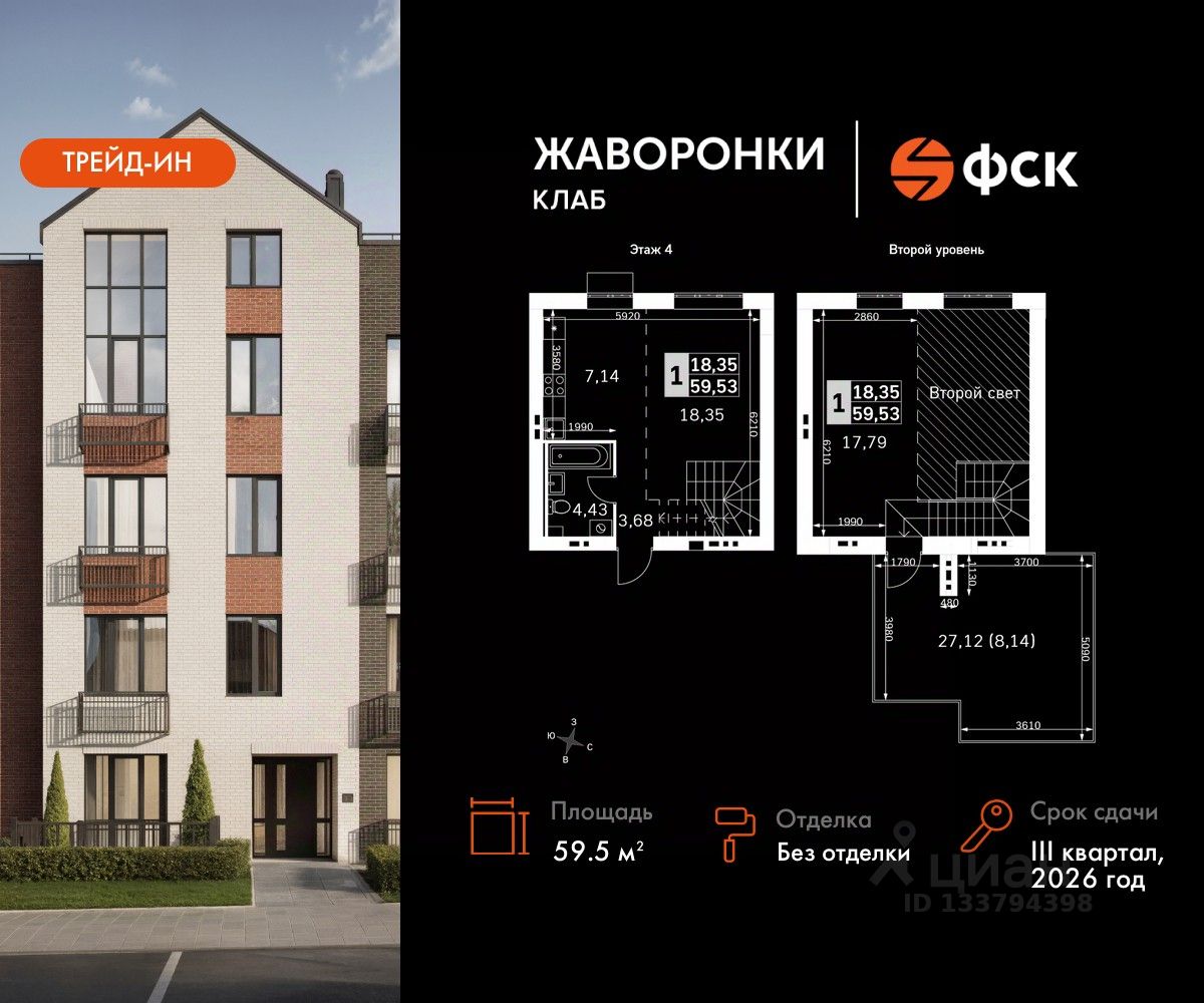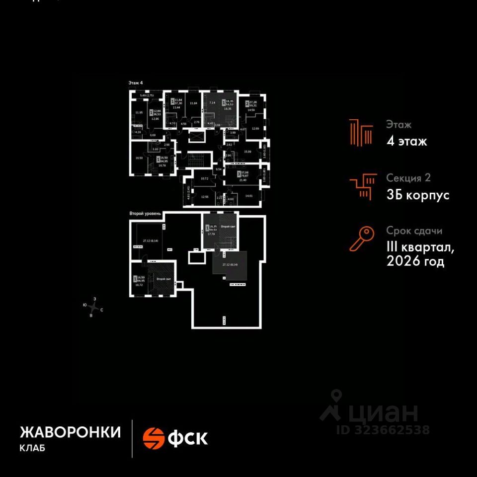 Продаётся 2-к квартира номер 34 общей площадью 59.53 кв.м на 4-м этаже 4 этажного дома. Без отделки.