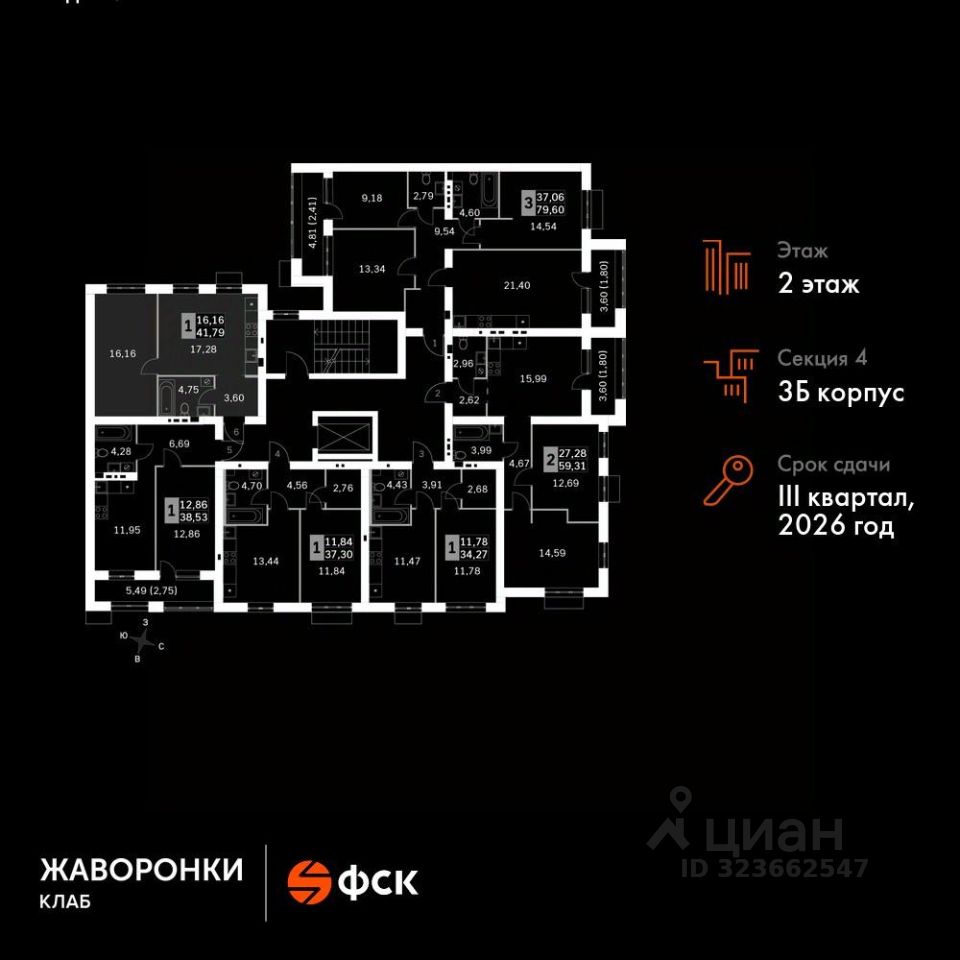 Продаётся 1-к квартира номер 60 общей площадью 41.79 кв.м на 2-м этаже 4 этажного дома. Без отделки.