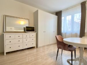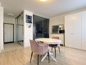 Общая площадь квартиры 38,1 м2 плюс балкон с панорамным остклением 3,6 м2. Планировка включает в себя спальню-нишу, просторную кухню-гостиную, совмещенный с/у с ванной. В квартире выполнен качественный ремонт, предусмотрено достаточно мест для хранения: вместительный гардеробный шкаф в прихожей, комод и шкаф в зоне гостиной, полноценная встроенная кухня с духовкой и посудомоечной машиной. Продается вместе с мебелью и техникой.