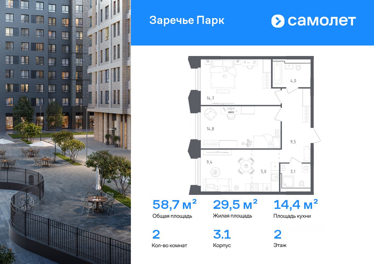 Строим кварталы для жизни с заботой о будущем. Предлагается 2-комнатная квартира бизнес-класса 58,7 кв.м в корпусе 3.1 на 2 этаже, в ЖК "Заречье Парк"
