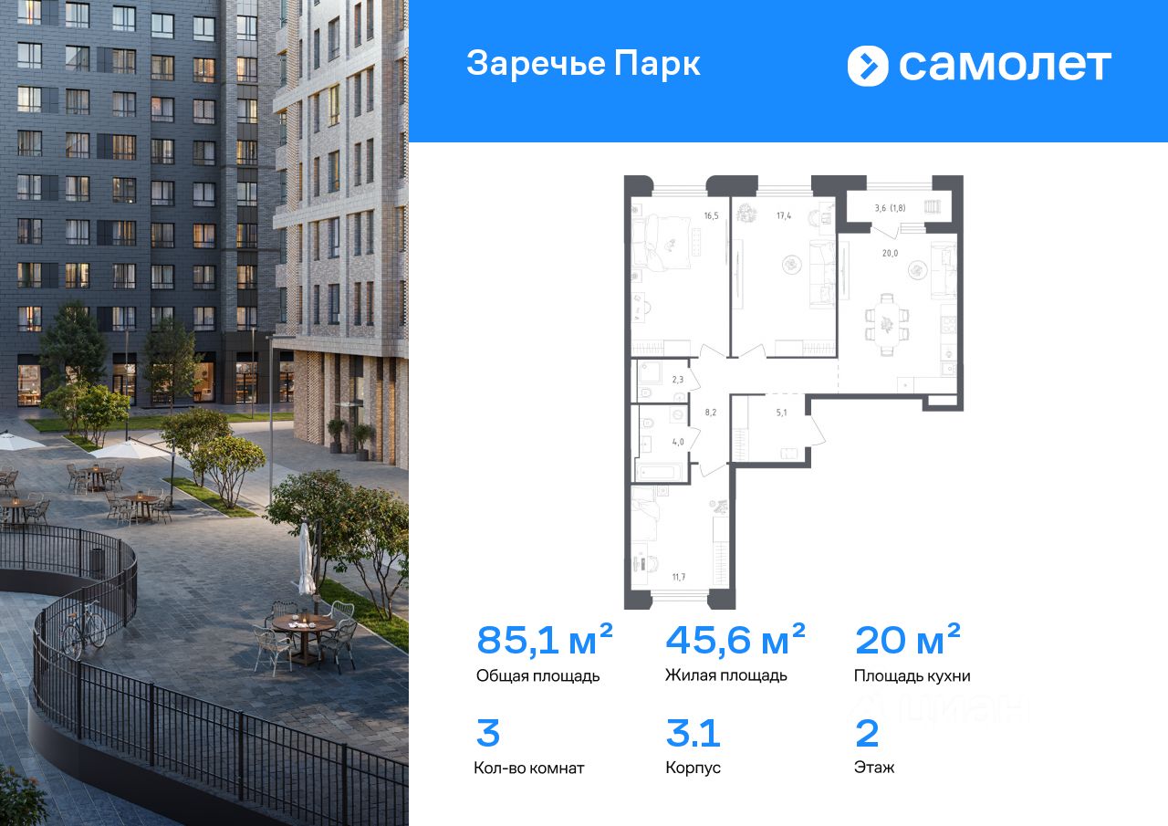 Строим кварталы для жизни с заботой о будущем. Предлагается 3-комнатная квартира бизнес-класса 85,1 кв.м в корпусе 3.1 на 2 этаже, в ЖК "Заречье Парк"