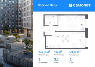 Строим кварталы для жизни с заботой о будущем. Предлагается 1-комнатная квартира бизнес-класса 43,9 кв.м в корпусе 3.1 на 2 этаже, в ЖК "Заречье Парк"
