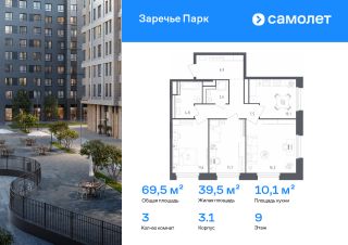 Строим кварталы для жизни с заботой о будущем. Предлагается 3-комнатная квартира бизнес-класса 69,5 кв.м в корпусе 3.1 на 9 этаже, в ЖК "Заречье Парк"