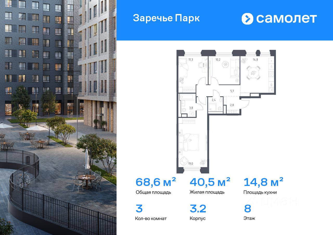 Строим кварталы для жизни с заботой о будущем. Предлагается 3-комнатная квартира бизнес-класса 68,6 кв.м в корпусе 3.2 на 8 этаже, в ЖК "Заречье Парк"