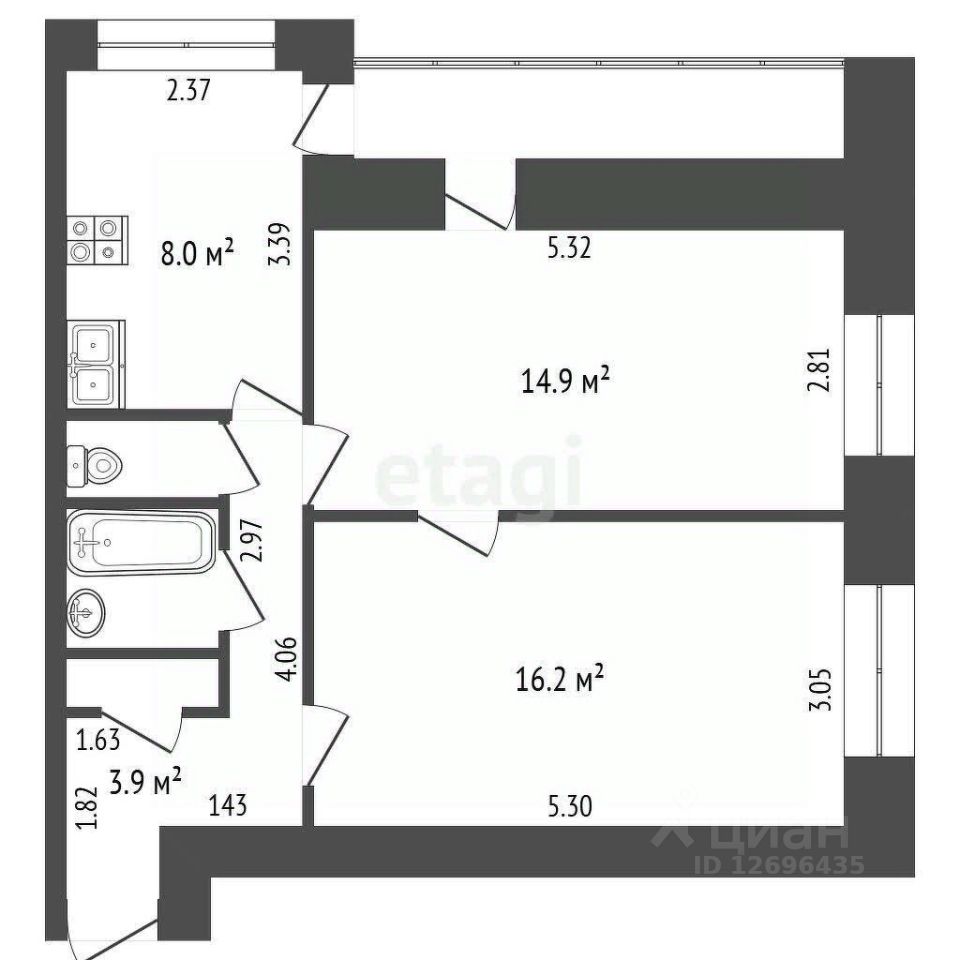 Санузел раздельный. Комнаты раздельные (16,2 и 14,9 кв.м.)