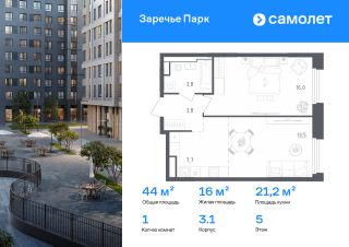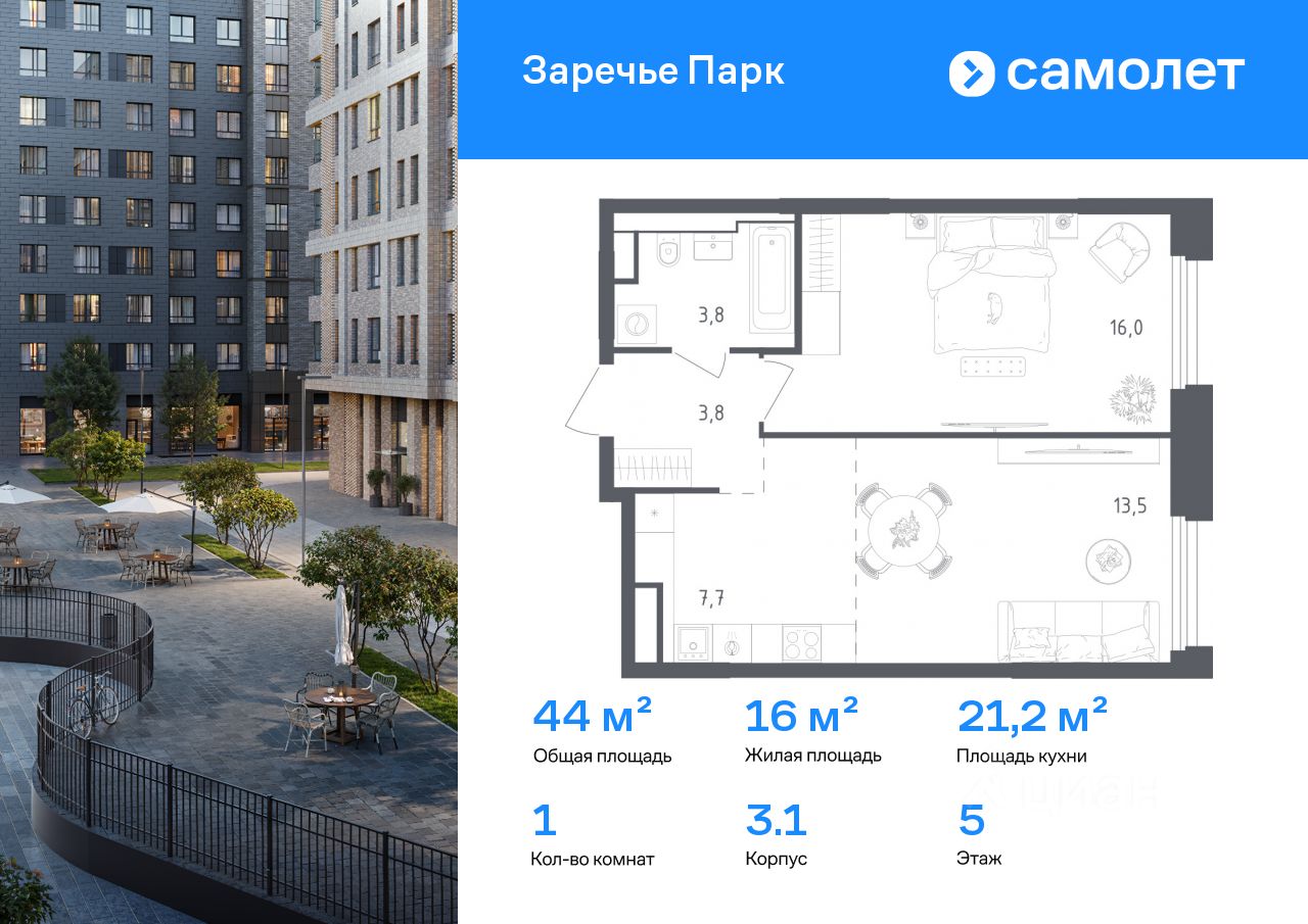 Строим кварталы для жизни с заботой о будущем. Предлагается 1-комнатная квартира бизнес-класса 44 кв.м в корпусе 3.1 на 5 этаже, в ЖК "Заречье Парк"