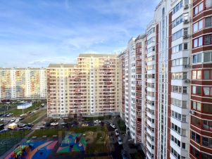 Продается трехкомнатная квартира с евроремонтом на десятом этаже 17-этажного панельного дома. Общая площадь — 77 кв. м, жилая — 46 кв. м, просторная кухня — 11 кв. м. Высота потолков — 2.7 метра. Окна выходят как во двор, так и на улицу, что обеспечивает хорошую освещенность и разнообразные виды.