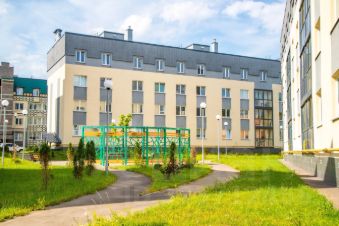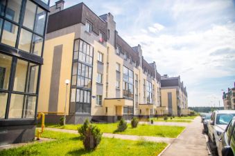 Дом располагается в центре ЖК и хорошо изолирован соседними домами от шума Минского шоссе и железнодорожных путей.