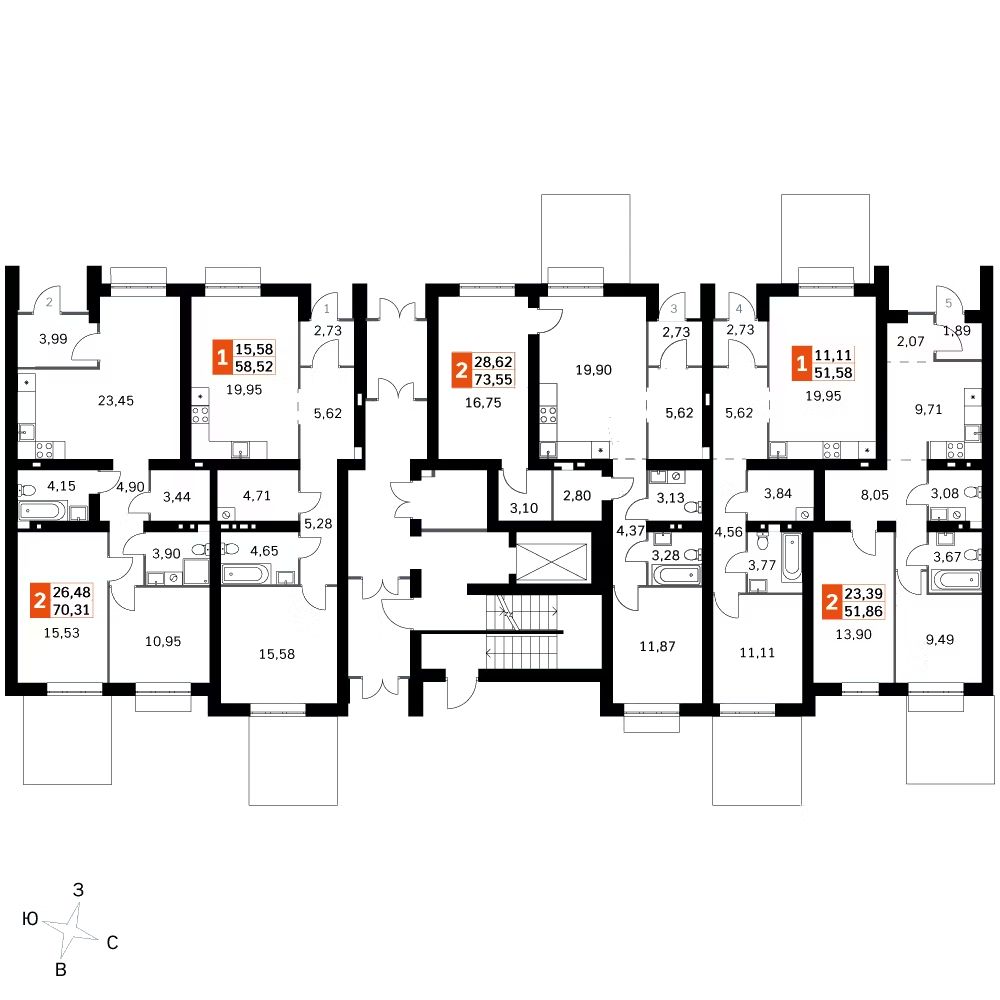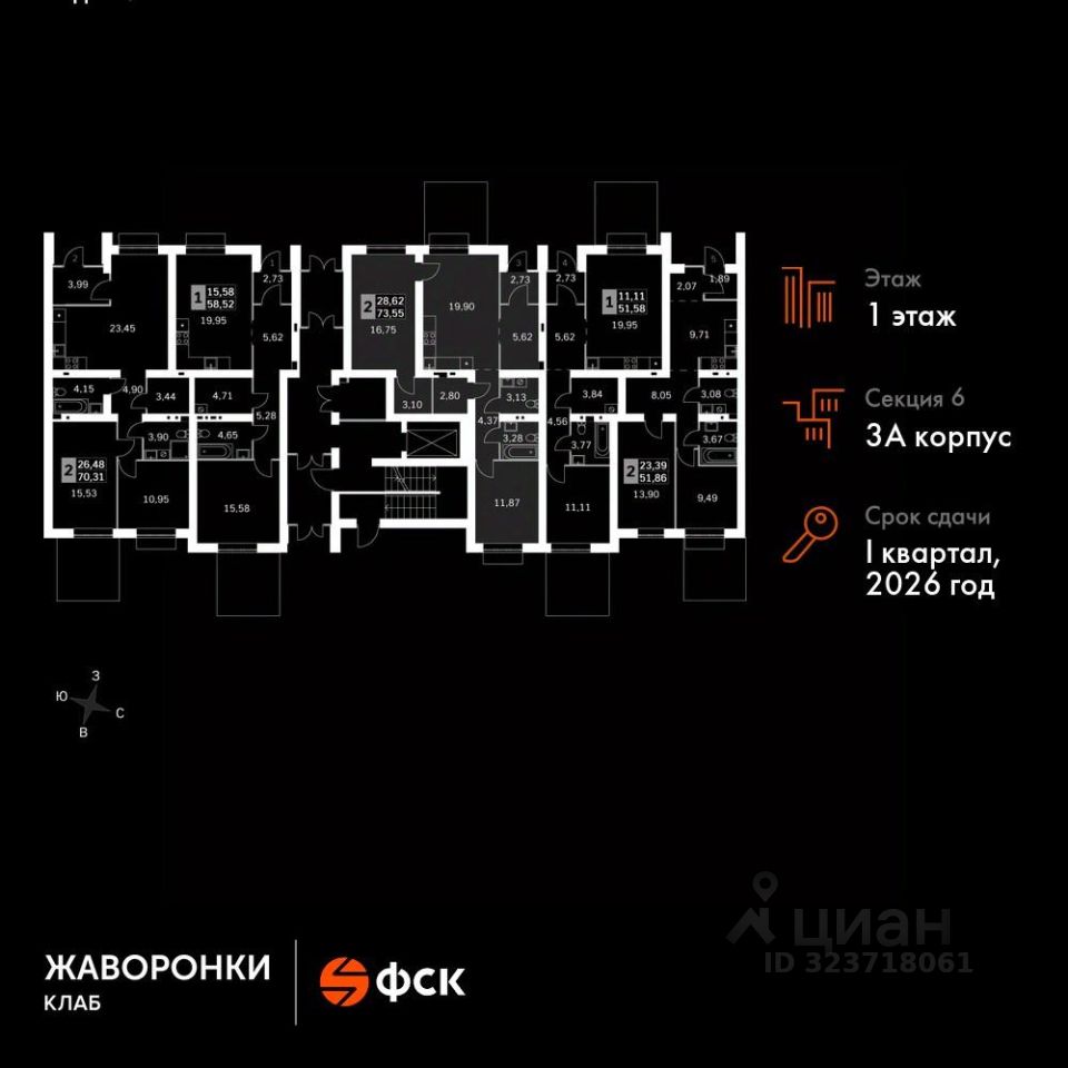 Продаётся 2-к квартира номер 113 общей площадью 73.55 кв.м на 1-м этаже 4 этажного дома. Без отделки.