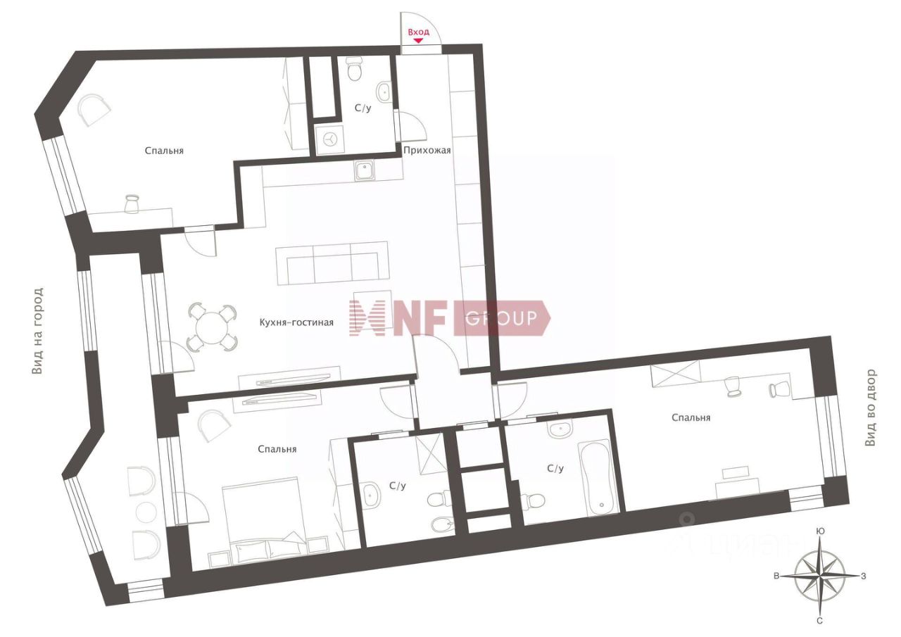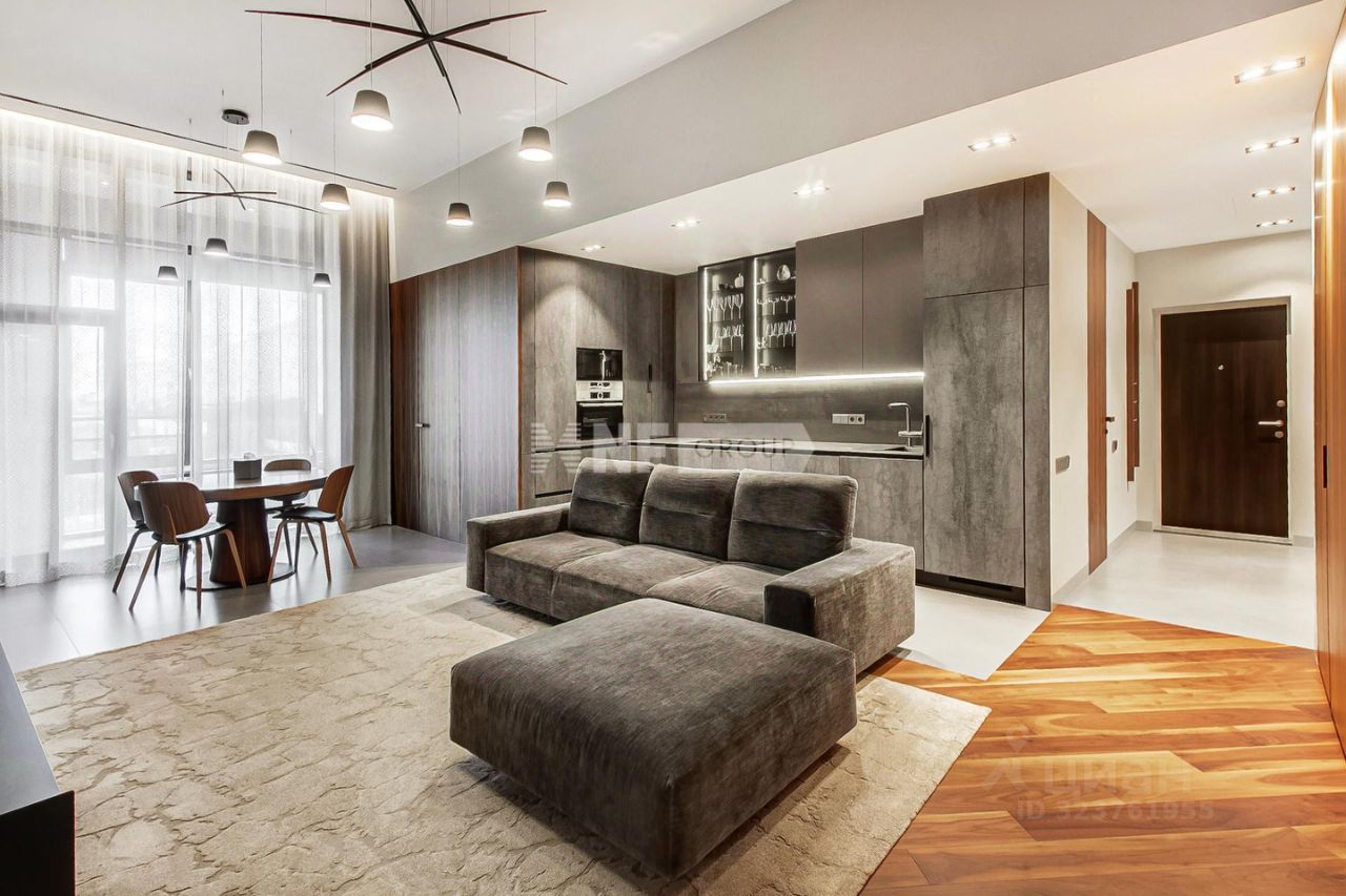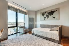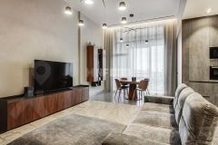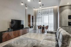 Планировка: гостиная с зоной кухни и тёплой лоджией, которую можно использовать под кабинет или спортзал, 3 спальни, 3 ванные комнаты, гардеробная.