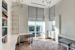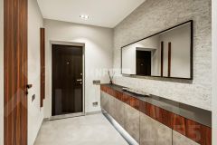 На стенах итальянские обои, на полу паркет из массива, выполненные на заказ двери из натурального дерева, зеркала Minotti.