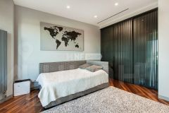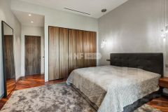 В мастер-спальне широкая двуспальная кровать с ортопедическим матрасом и мягким изголовьем.