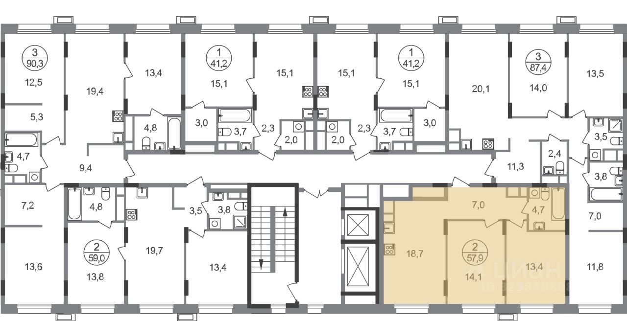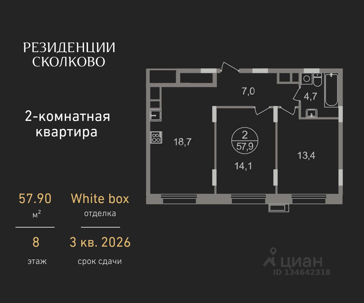 Общая площадь квартиры - 57,9 кв. м, этаж 8 из 9.
