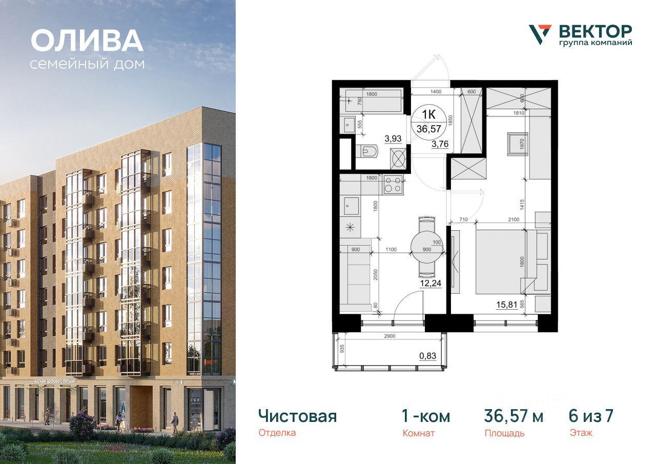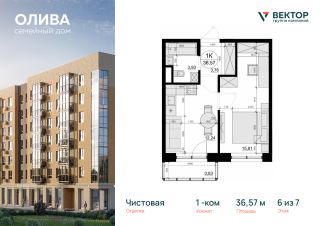 Продается 1-комн. квартира площадью 36,57 кв.м на 6 этаже 7 этажного дома в ЖК "Семейный дом Олива" от федерального девелопера ГК "Вектор".