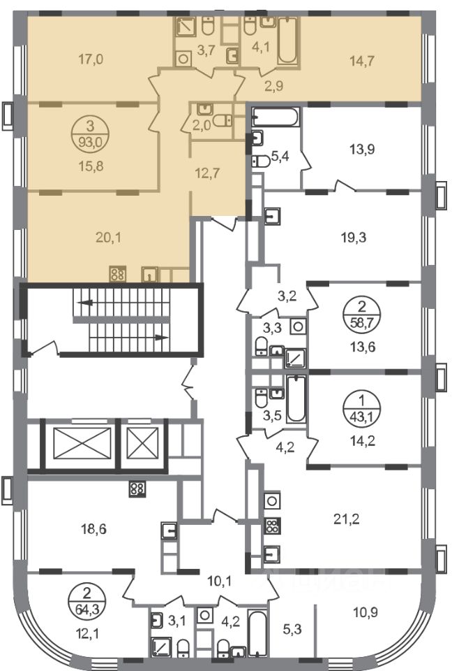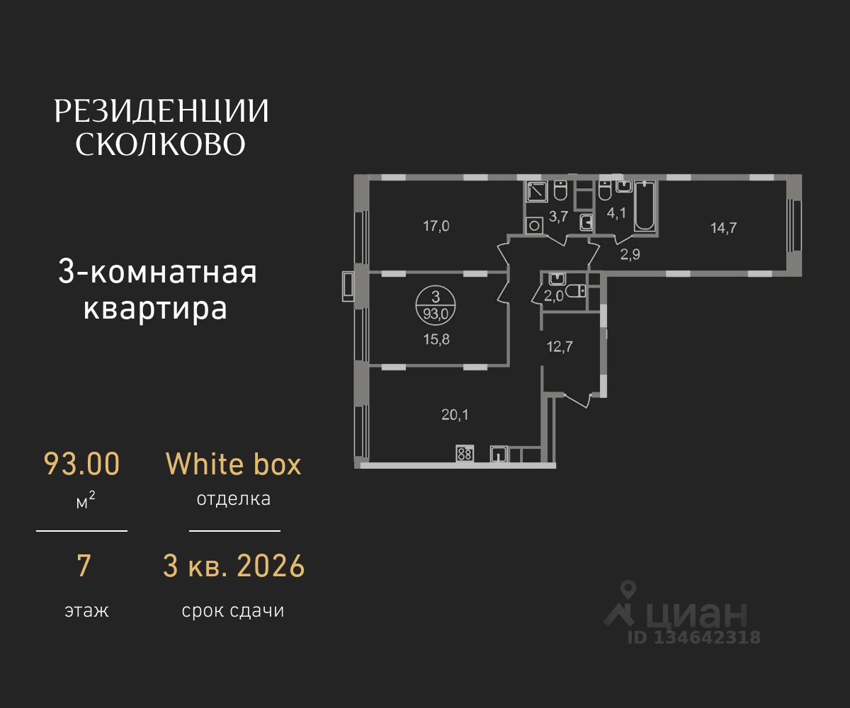 Общая площадь квартиры - 93 кв. м, этаж 7 из 9.