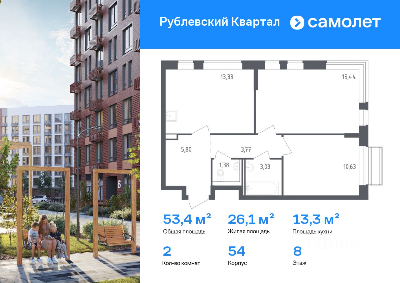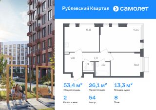 Строим кварталы для жизни с заботой о будущем. Предлагается 2-комнатная квартира комфорт-класса 53,38 кв.м в корпусе 54 на 8 этаже, в ЖК "Рублевский Квартал"