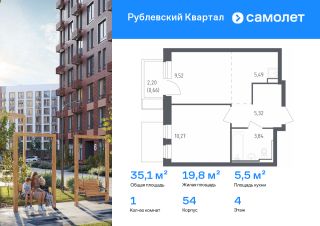 Строим кварталы для жизни с заботой о будущем. Предлагается 1-комнатная квартира комфорт-класса 35,1 кв.м в корпусе 54 на 4 этаже, в ЖК "Рублевский Квартал"