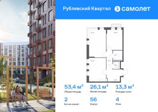 Строим кварталы для жизни с заботой о будущем. Предлагается 2-комнатная квартира комфорт-класса 53,38 кв.м в корпусе 56 на 4 этаже, в ЖК "Рублевский Квартал"