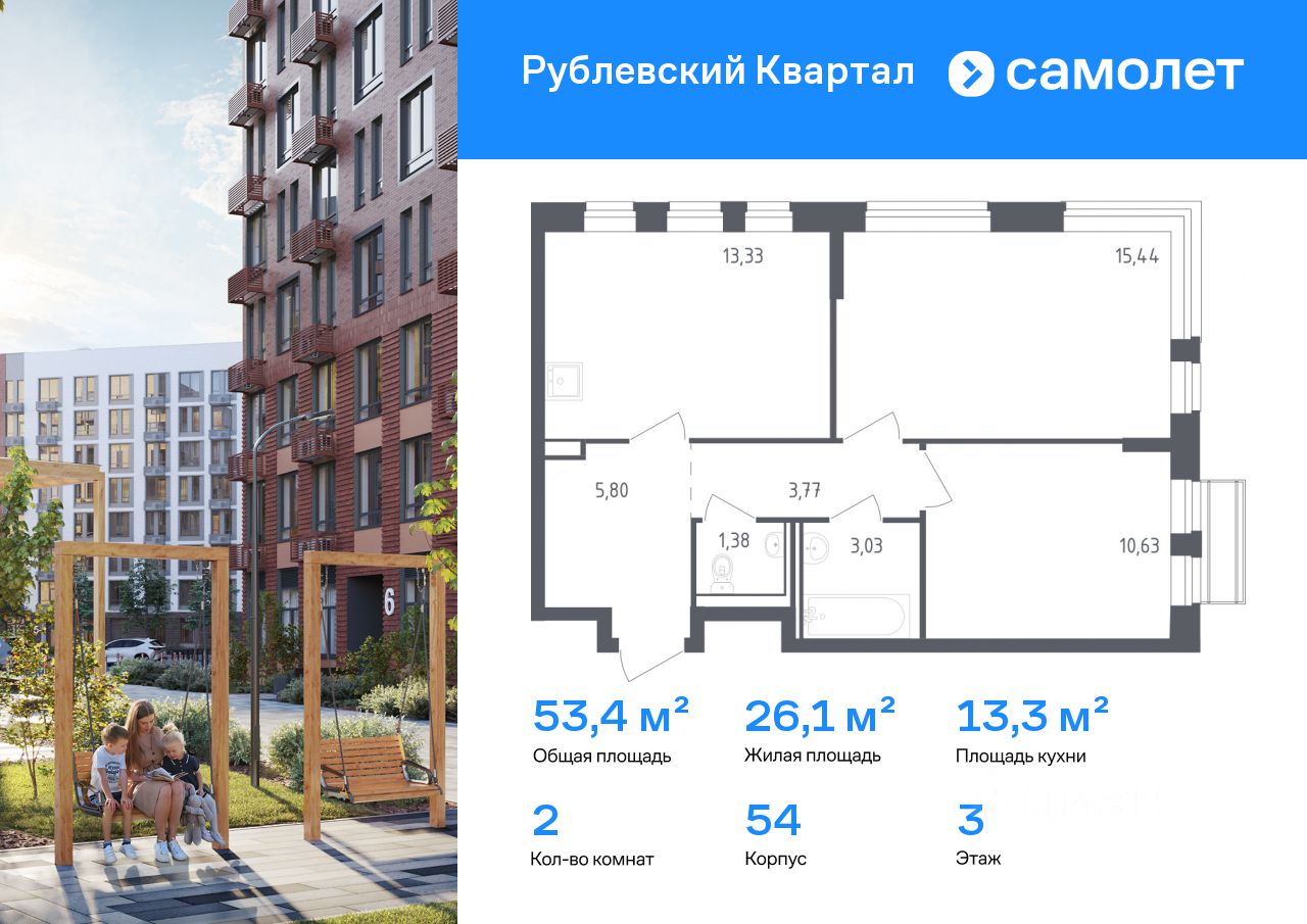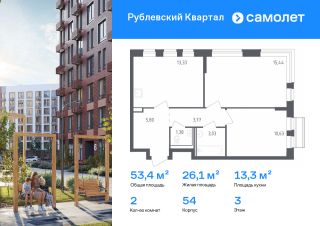 Строим кварталы для жизни с заботой о будущем. Предлагается 2-комнатная квартира комфорт-класса 53,38 кв.м в корпусе 54 на 3 этаже, в ЖК "Рублевский Квартал"